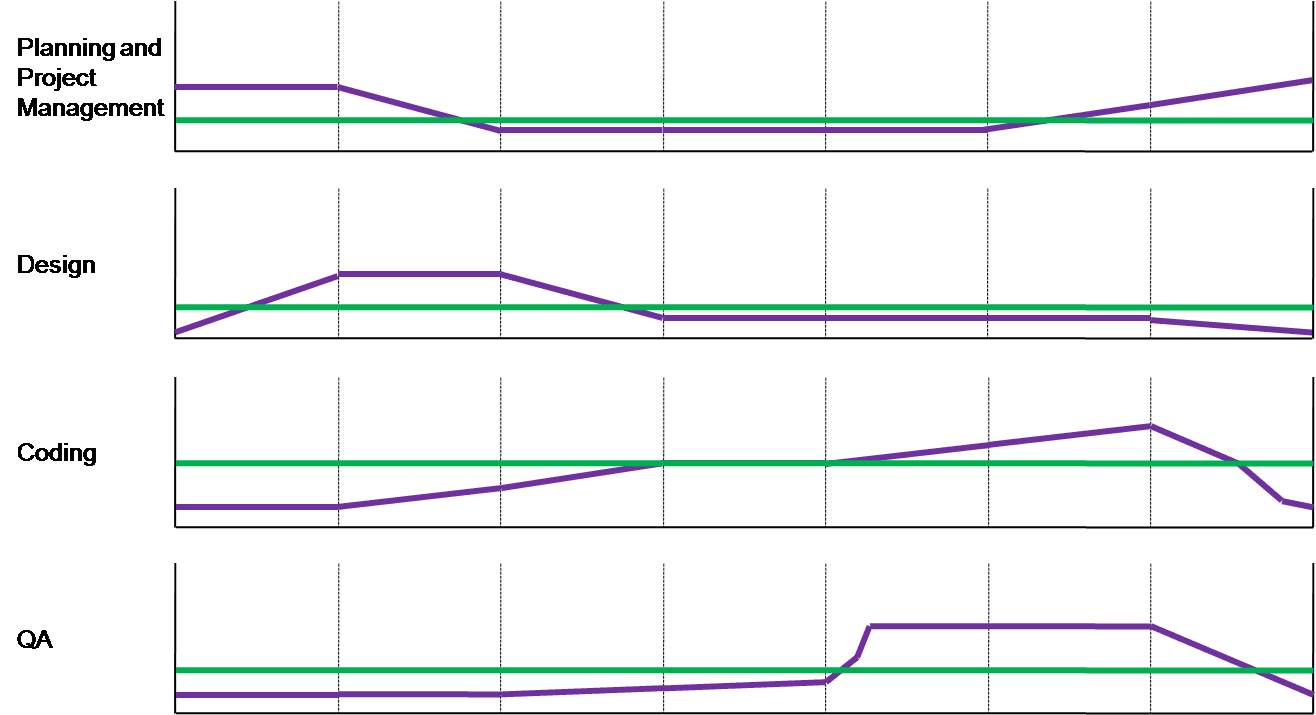 In the figure above, the straight green lines represent the resource load in an Agile project and the zig-zagging purple lines represent the resource load in a traditional project.